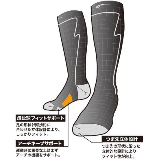 雪面状況をすばやく捉える薄型フィット設計。薄くても暖かい発熱素材にメリノウールをプラスしたレーサー仕様ソックス。